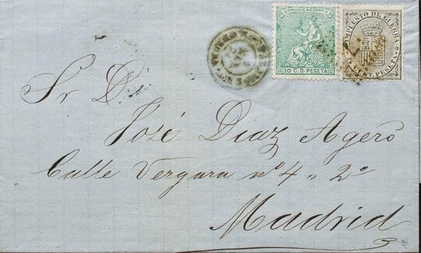 133, 141. 1874. 10 cts green and 5 cts black. PALAMOS to MADRID. On the front dater PALAMOS / GERONA. MAGNIFICENT. Ex-Blight.