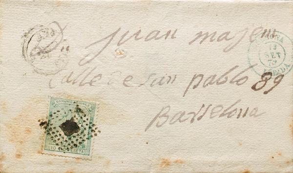 133. 1873. 10 cts green. ARENYS DE MAR to BARCELONA. On the front dater ARENYS DE MAR / BARCELONA. MAGNIFICENT AND RARE. Ex-Blight.