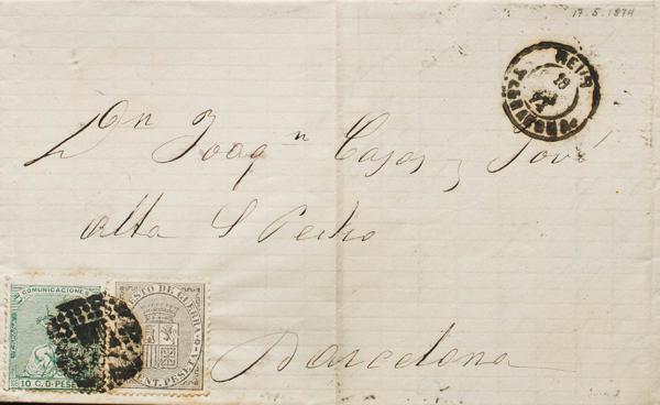 153, 141. 1874. 10 cts chestnut and 5 cts black. REUS to BARCELONA. Postmark REUS / TARRAGONA. MAGNIFICENT. Ex-Blight.