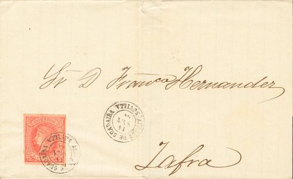64. 1864. 4 red cuartos . CADIZ to SEVILLE. Postmark R. CARRETA Nº 3.