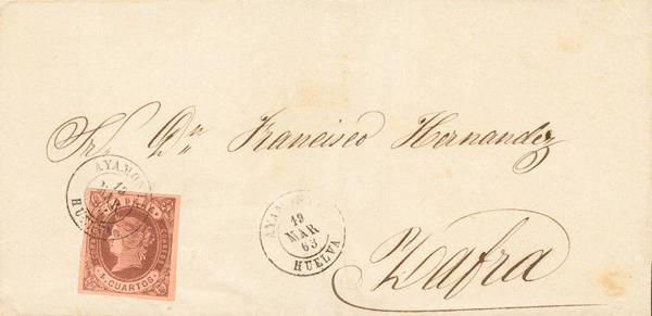 52. 1861. 4 orange cuartos . OVEJUNA SOURCE to TRUJILLO. Postmark FUENTE OVEJUNA / CORDOBA. MAGNIFICENT.