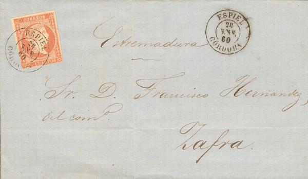 52. 1860. 4 orange cuartos . ESPIEL to TRUJILLO. Postmark ESPIEL / CORDOBA. MAGNIFICENT AND RARE.