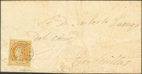 52. 1862. 4 orange cuartos . ALAEJOS to TORDESILLAS. Postmark ALAEJOS / VALLADOLID. MAGNIFICENT AND VERY RARE.
