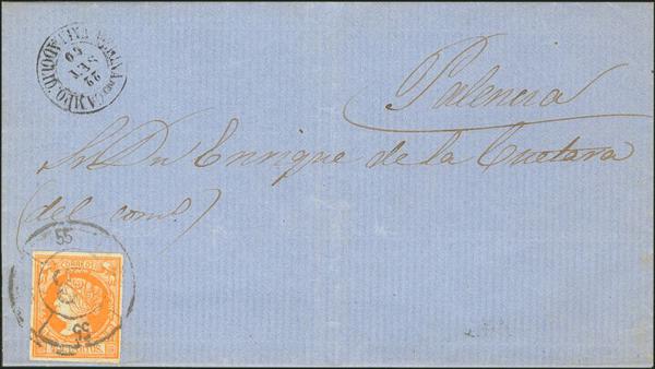 52. 1860. 4 orange cuartos . VILLALON to MADRID. Postmark VILLALON / VALLADOLID. MAGNIFICENT AND RARE.