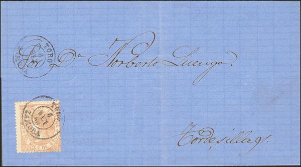 96. 1868. 50 thousand chestnut. BULL to TORDESILLAS. TORO / ZAMORA postmark. MAGNIFICENT.