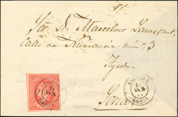 52. 1860. 4 orange cuartos . AGREDA to CERVERA DEL RIO ALHAMA. Postmark AGREDA / SORIA. MAGNIFICENT.