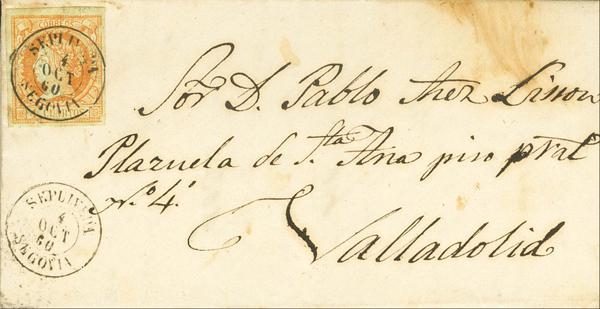 |ABOUT| 52. 1860. 4 orange quarters. SEPULVEDA to VALLADOLID. Postmark SEPULVEDA / SEGOVIA. MAGNIFICENT AND RARE.