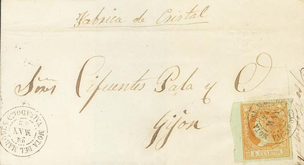 52. 1862. 4 cuartos orange, leaf edge. MOTA DEL MARQUES to GIJON. Postmark MOTA DEL MARQUES / VALLADOLID. MAGNIFICENT AND VERY RARE.