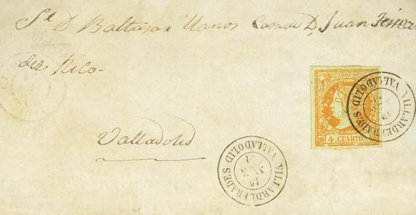 |ABOUT| 52. 1861. 4 orange quarters. Front from VILLAR DE FRADES to VALLADOLID. Postmark VILLAR DE FRADES / VALLADOLID. MAGNIFICENT AND VERY RARE.