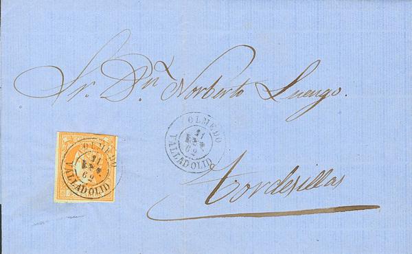 52. 1862. 4 orange cuartos . OLMEDO to TORDESILLAS. Postmark OLMEDO / VALLADOLID. MAGNIFICENT.