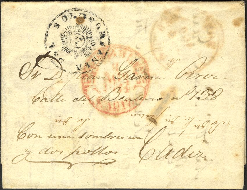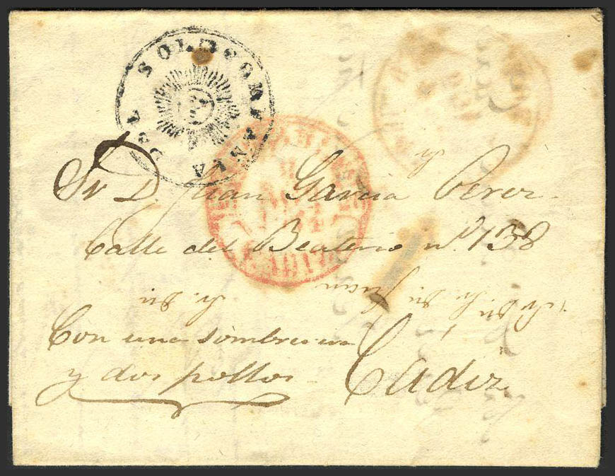 1844. SHERRY to CADIZ. COMPAÑÍA DEL SOL brand, in black (PE 27). RARE AND BEAUTIFUL.
