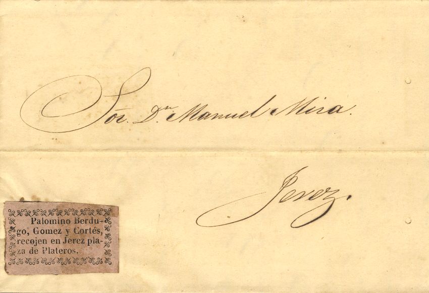 1858. CADIZ to JEREZ DE LA FRONTERA. Label PALOMINO BERDUGO / GOMEZ Y CORTES / PICK UP IN JEREZ / PLAZA DE PLATEROS, in pink (Chanivet 59). MAGNIFICENT AND VERY RARE.