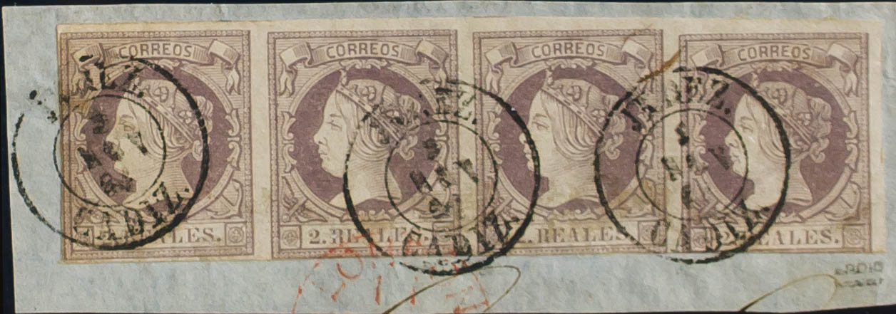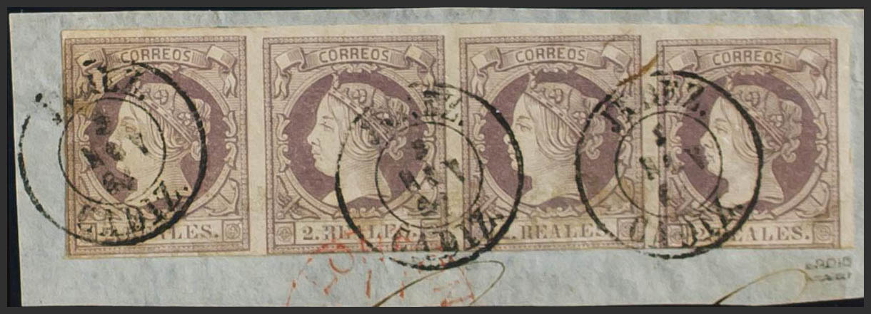 English △ 56(4). 1860. 2 lilac reales , strip of four, on fragment. Postmark JEREZ / CADIZ. MAGNIFICENT. Edifil 2014: +++95 Euros