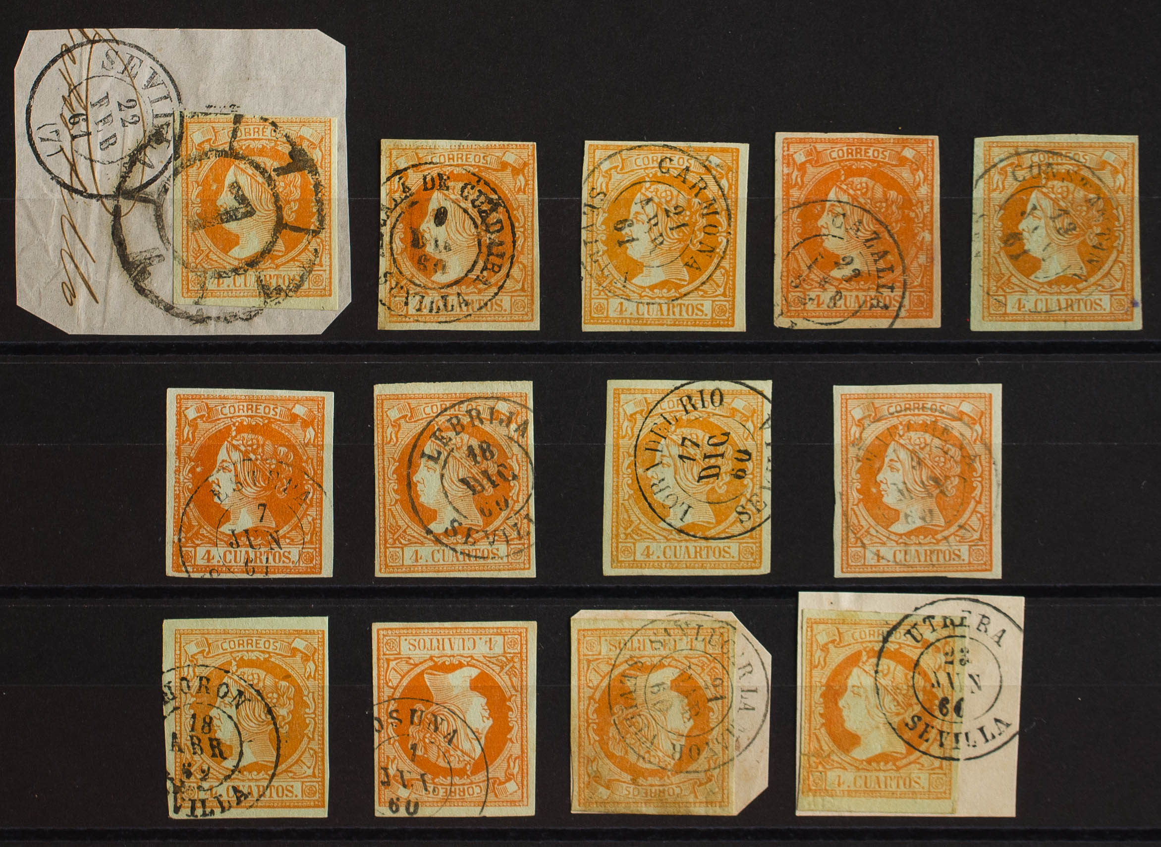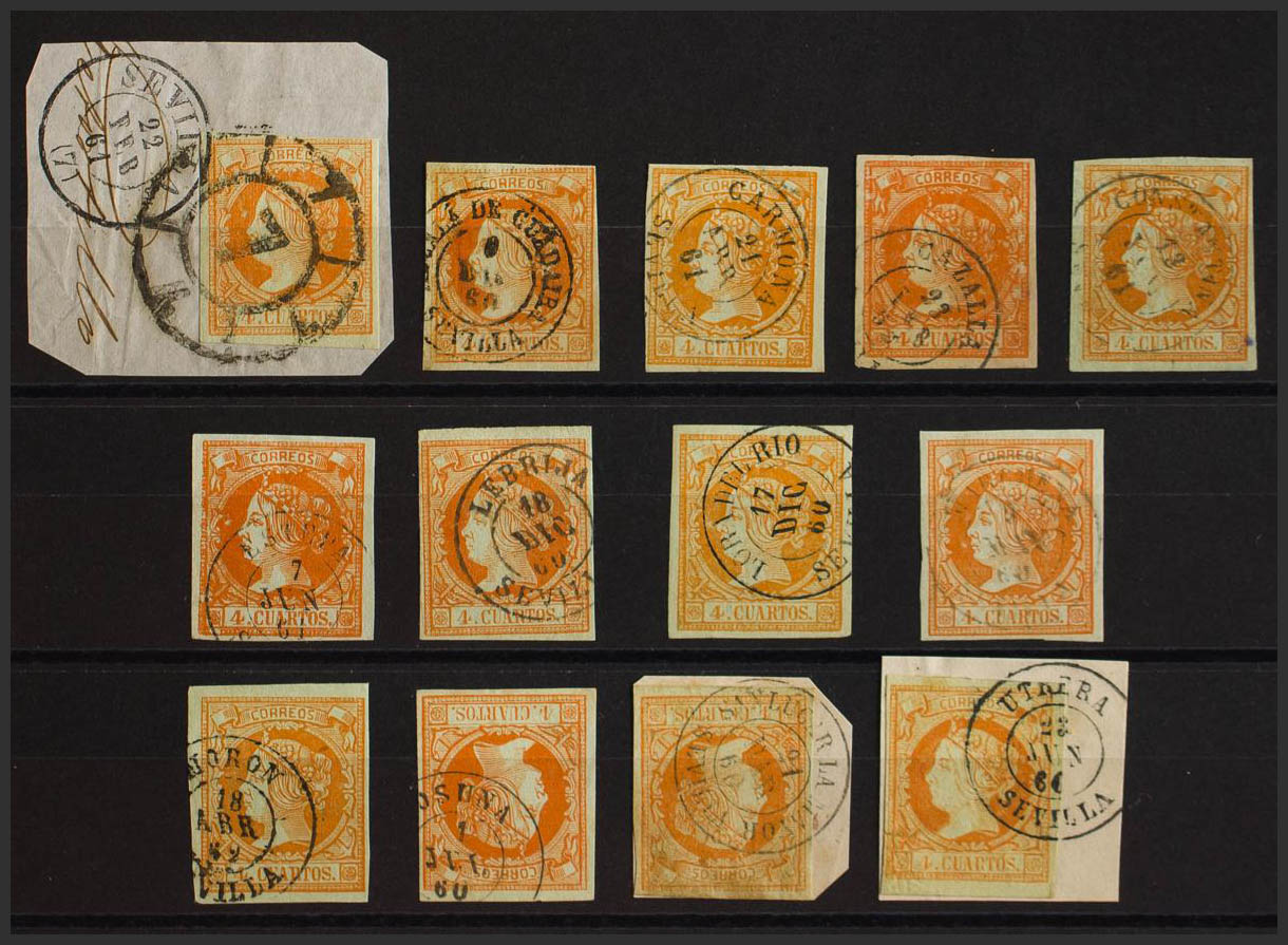 English 52(13). 1860. Set of thirteen unused yellow 4- cuartos stamps with the dates of the province of Sevilla: Mixed SEVILLA and R.CARRETA Nº7, ALCALA DE GUADAIRA, CARMONA, CAZALLA, CONSTANTINA, ESTEPA, LEBRIJA, LORA DEL RIO, MARCHENA, MORON, OSUNA, SANLUCAR LA MAYOR and UTRERA. MAGNIFICENT.