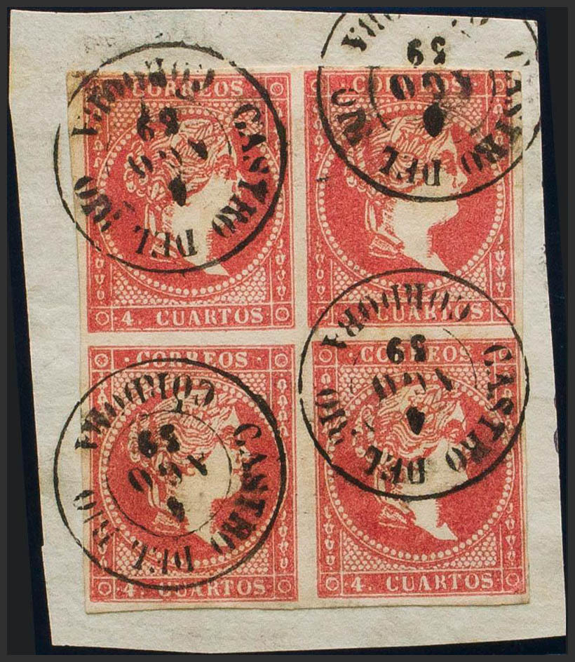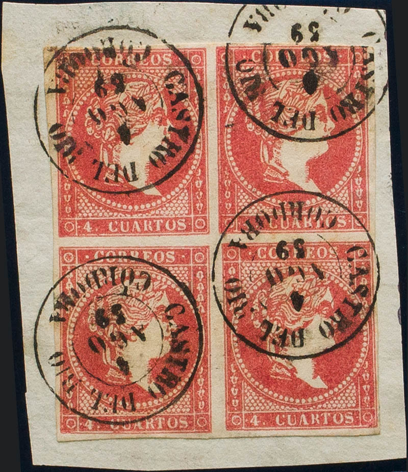 △ 48(4). 1856. 4 red cuartos , block of four, on fragment. Postmark CASTRO DEL RIO / CORDOBA. MAGNIFICENT.