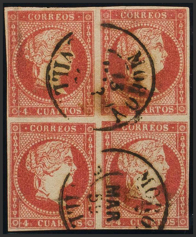 English 48(4). 1856. 4 red cuartos , block of four. Postmark MORON / SEVILLA (Type I). MAGNIFICENT AND VERY RARE.