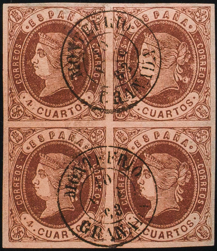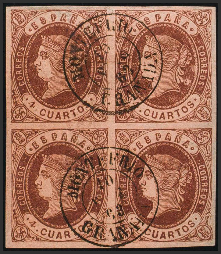 58(4). 1862. 4 chestnut cuartos , block of four. Postmark MONTEFRIO / GRANADA. MAGNIFICENT AND RARE.