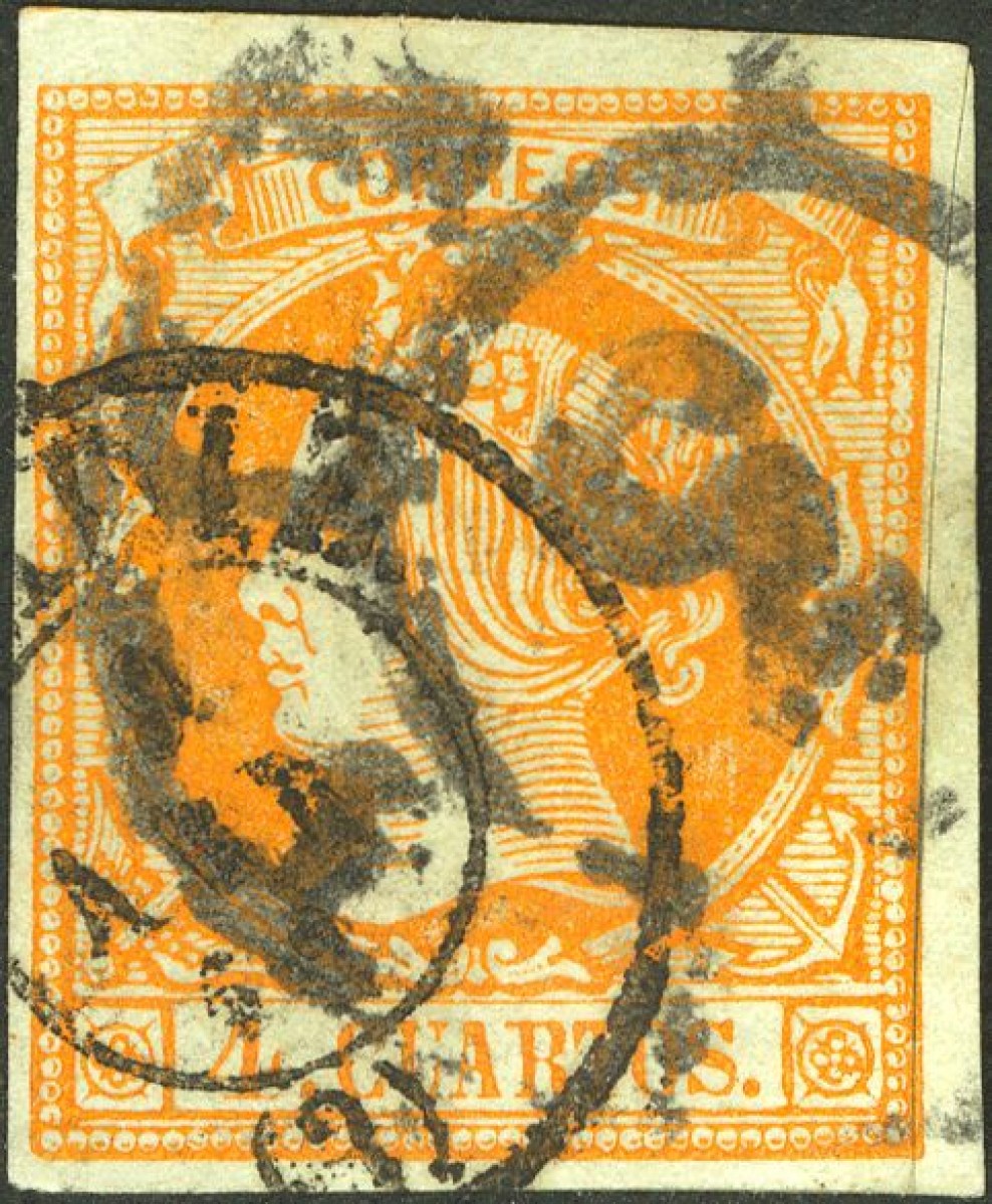 52. 1860. 4 cuartos yellow. Postmark CADIZ / (3) and R. CARRETA Nº 3.