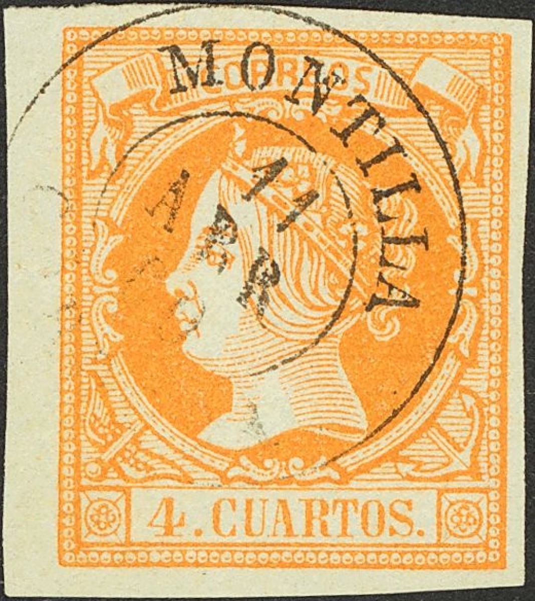 52. 1860. 4 cuartos yellow. Postmark MONTILLA / CORDOBA. MAGNIFICENT.