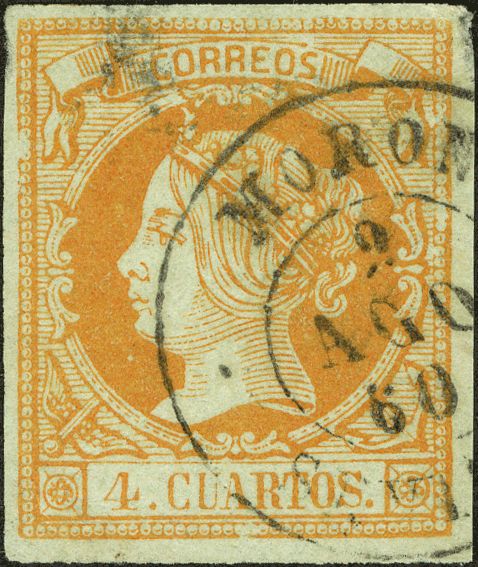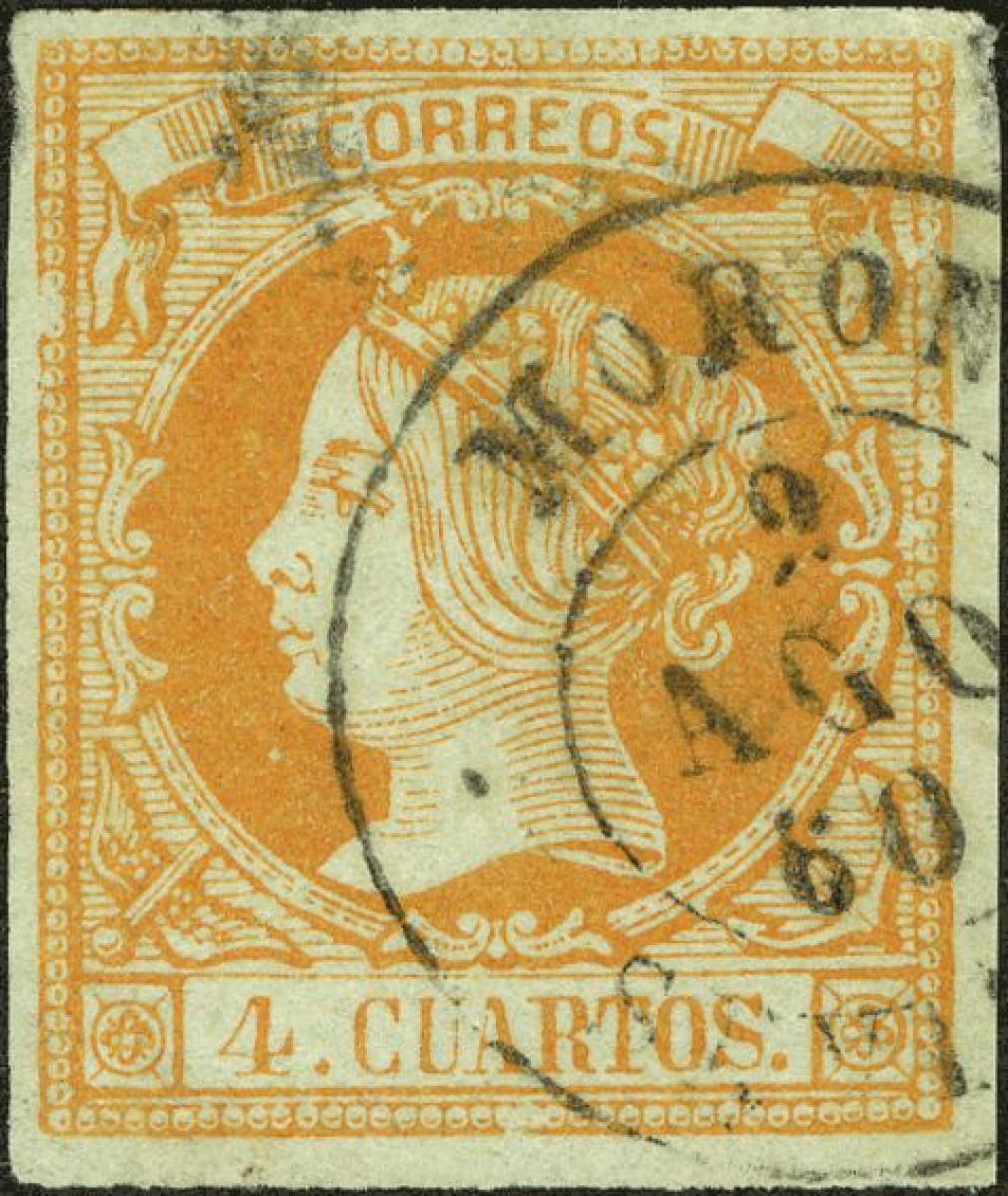 52. 1860. 4 cuartos yellow. Postmark MORON / SEVILLE.