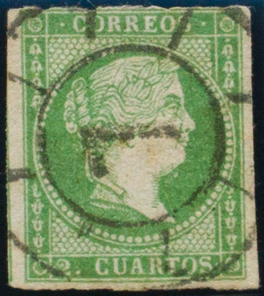 English 47. 1855. 2 cuartos green. Postmark R.CARRETA Nº7, from Sevilla. MAGNIFICENT.