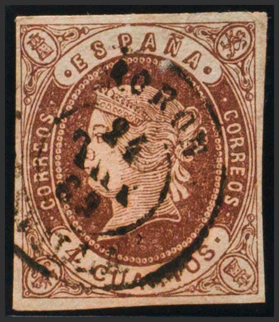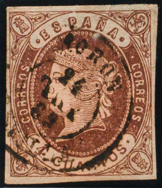 58. 1862. 4- cuartos chestnut. Postmark MORON / SEVILLE. MAGNIFICENT.