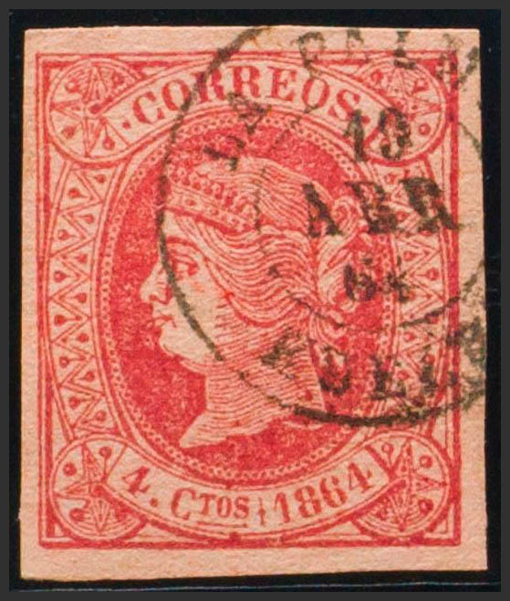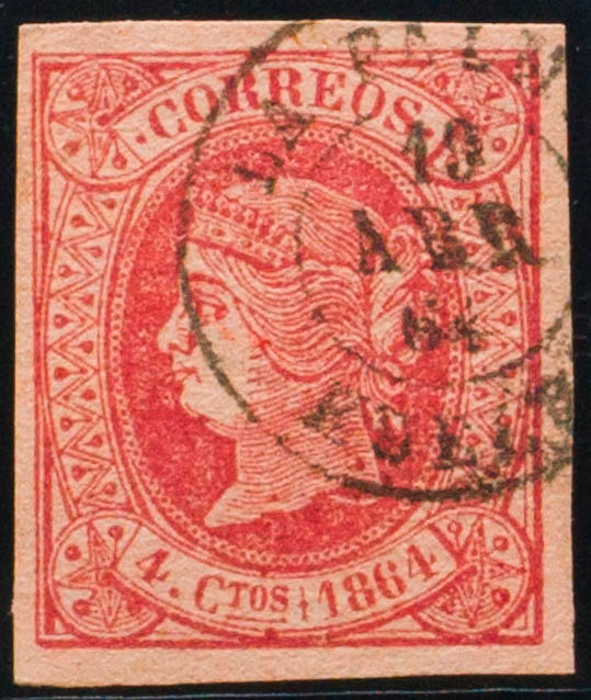 64. 1864. 4 red cuartos . Postmark LA PALMA / HUELVA. MAGNIFICENT.