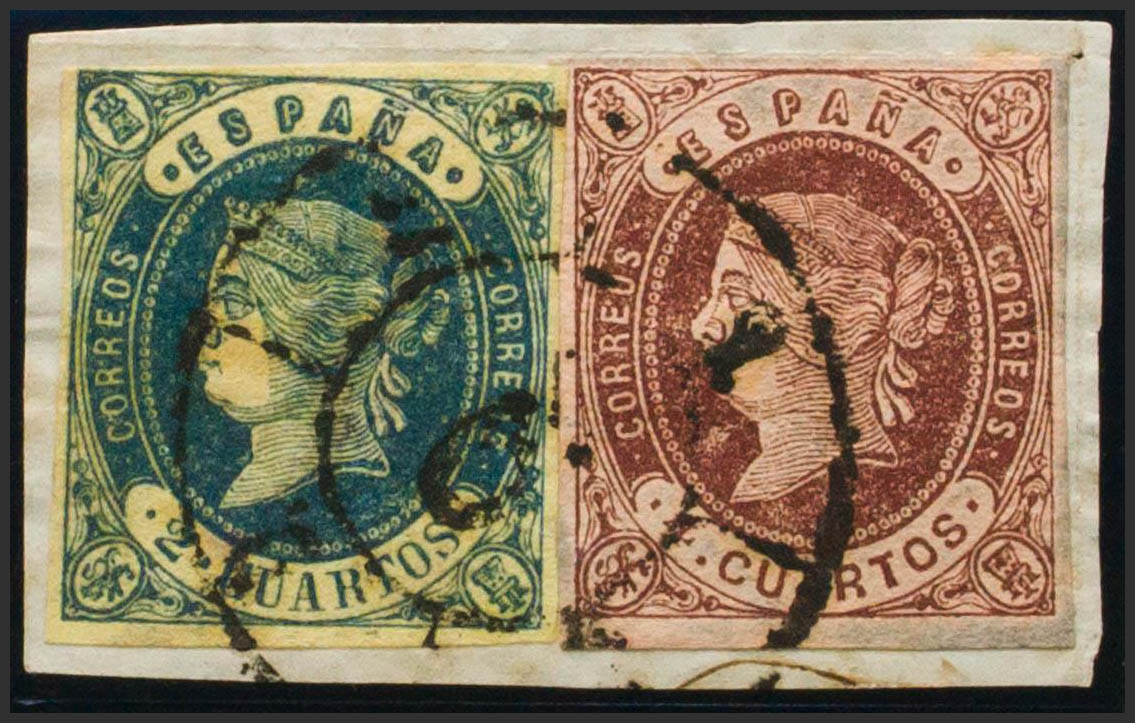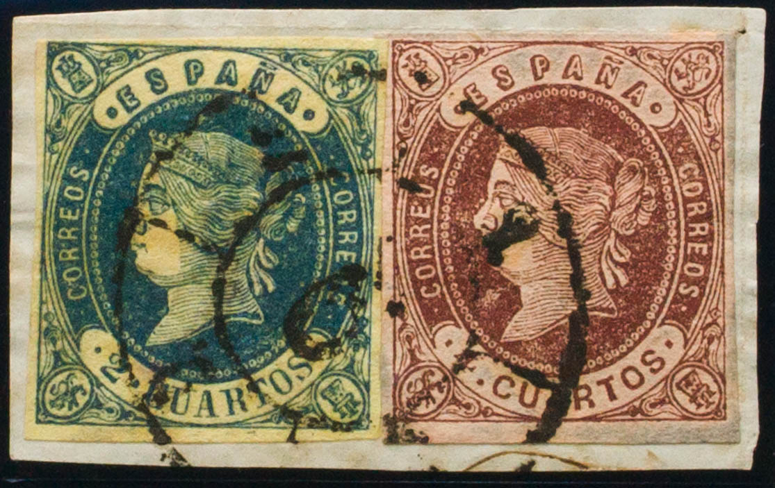 57, 58. 1862. 2 cuartos blue and 4 cuartos chestnut, on fragment. Postmark R. CARRETA Nº6, from Málaga. MAGNIFICENT AND RARE COMBINATION TO COMPLETE THE RATE TO PORTUGAL.