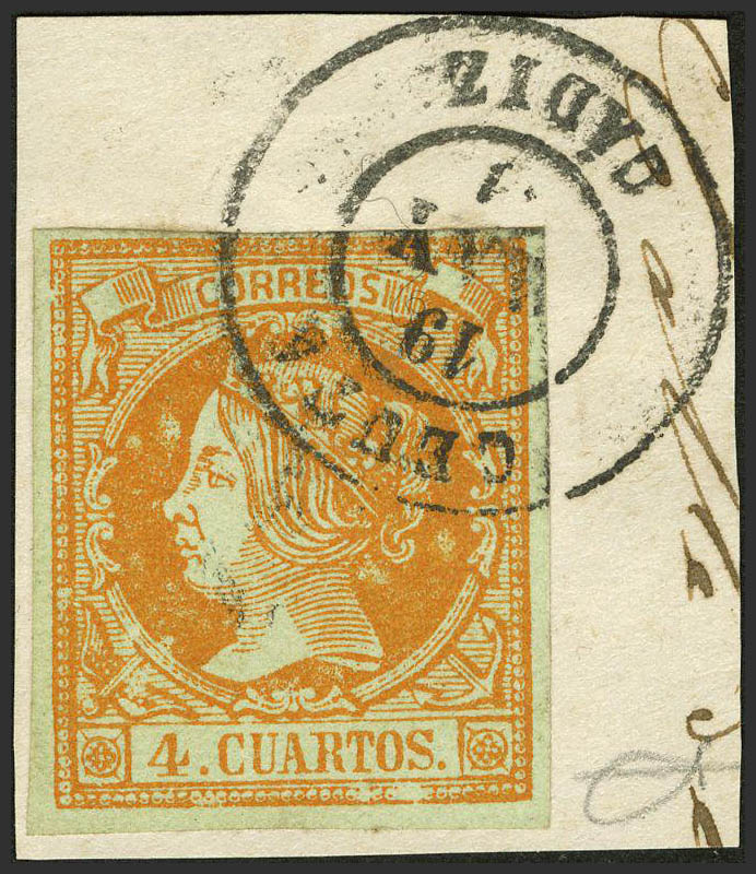 △ 52. 1860. 4 yellow cuartos , on fragment. Postmark CEUTA / CADIZ. MAGNIFICENT.