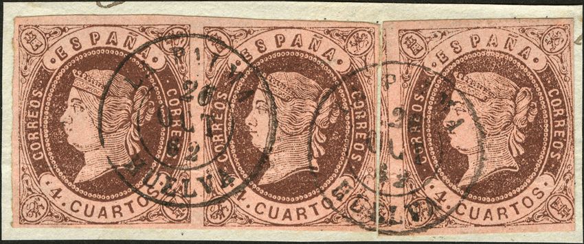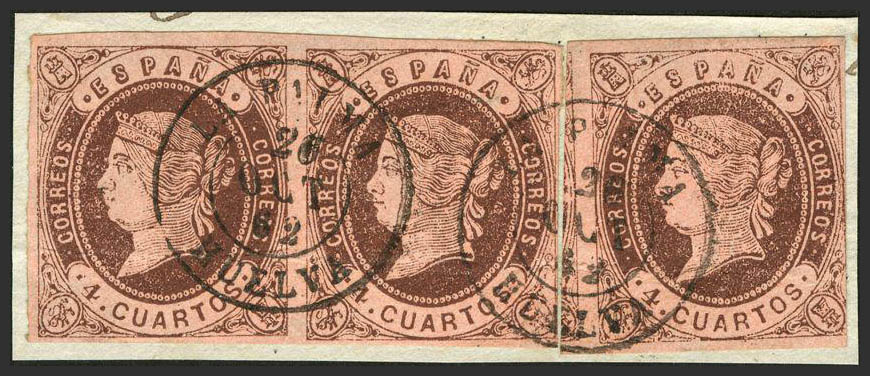 △ 58(3). 1862. 4 chestnut cuartos , pair and stamp, on fragment. Postmark LA PALMA / HUELVA. MAGNIFICENT.