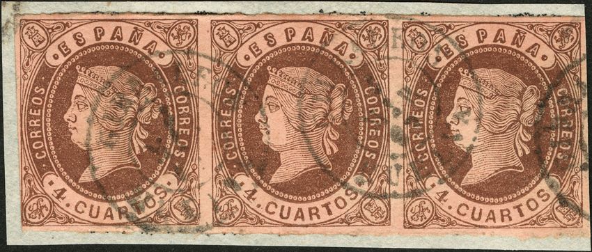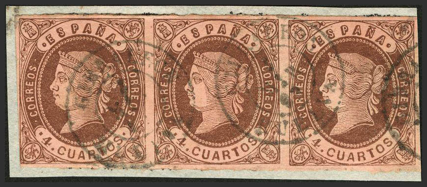 58(3). 1862. 4 chestnut cuartos , strip of three. Date postmark GIBRALEON / HUELVA. NICE.