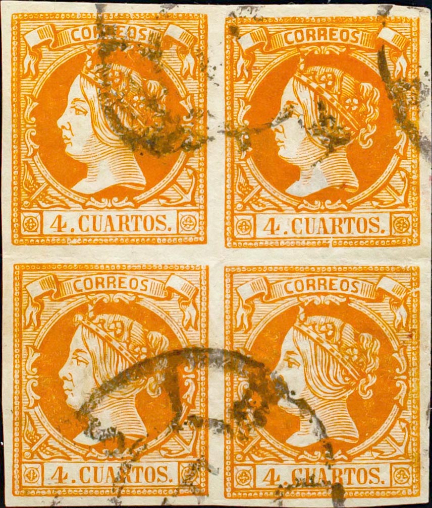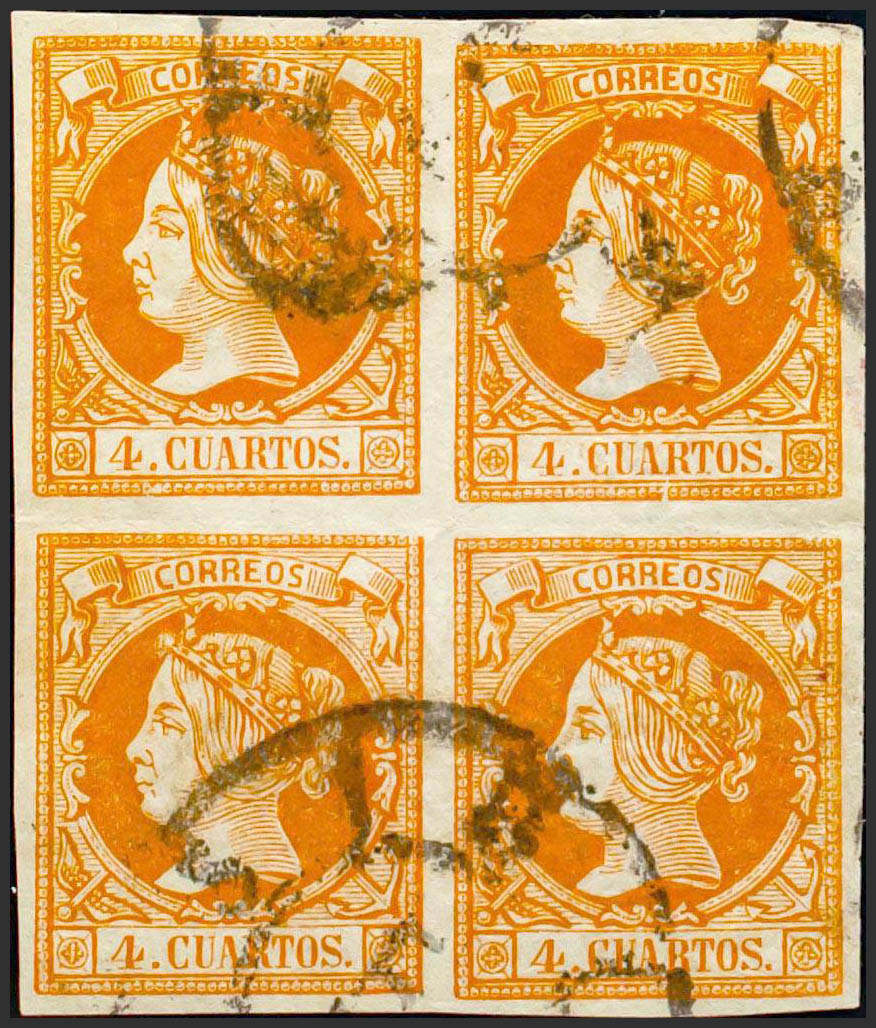 52(4). 1860. 4 yellow cuartos , block of four. Postmark R.CARRETA Nº6, from Granada. MAGNIFICENT.