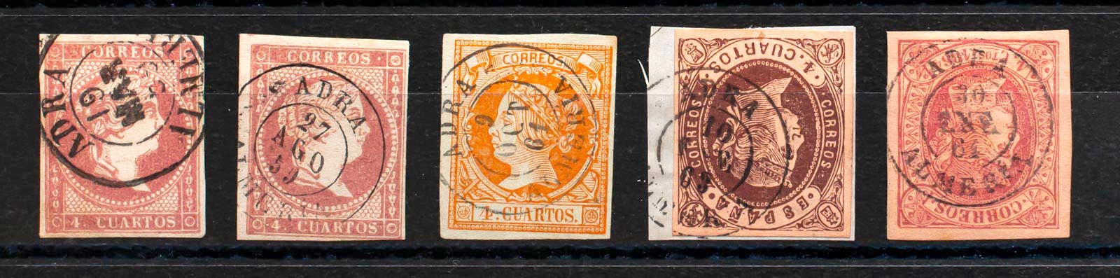 48(2), 52, 58, 64. (1855ca). Set of five 4- cuartos red, yellow, brown and pink stamps, unused with the ADRA / ALMERIA postmark (including Type I on the 4- cuartos red). MAGNIFICENT.
