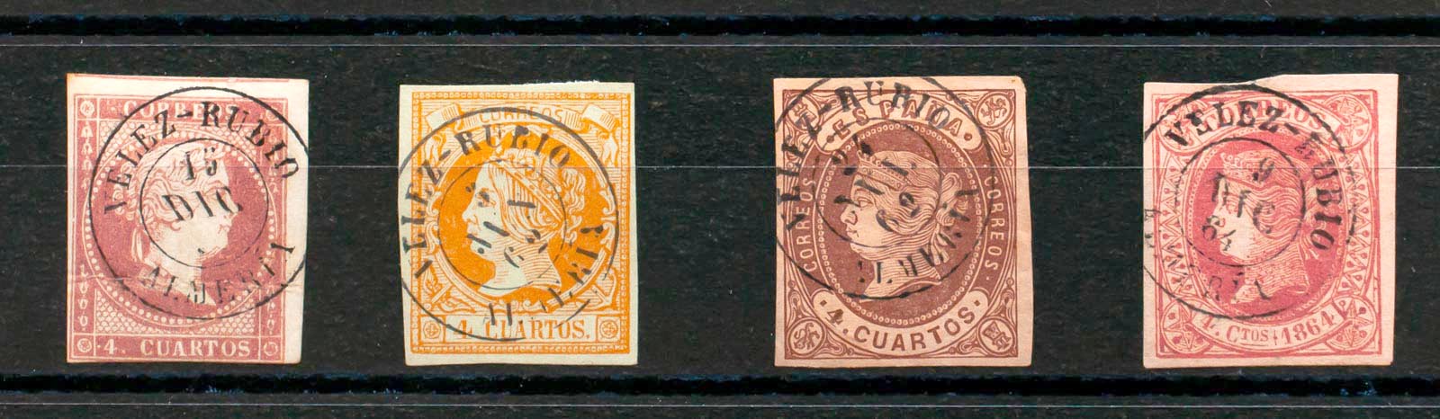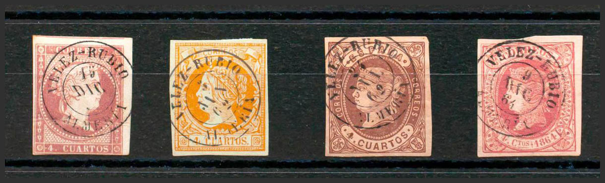 48, 52, 58, 64. (1855ca). Set of four 4- cuartos stamps red, yellow, brown and pink, unused with the VELEZ RUBIO / ALMERIA postmark. MAGNIFICENT.
