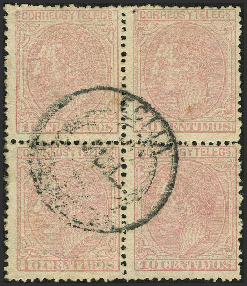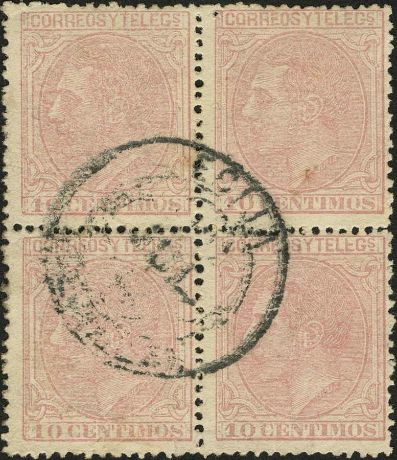 204(4). 1879. 10 rose cts, block of four. Postmark ECIJA / SEVILLE. NICE.