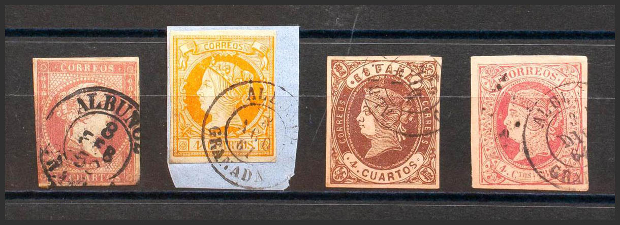 48, 52, 58, 64. (1855ca). Set of four stamps of the 4 cuartos red, yellow, brown and pink, unused with ALBUÑOL / GRANADA postmark (Type I on the 4 cuartos red). MAGNIFICENT.