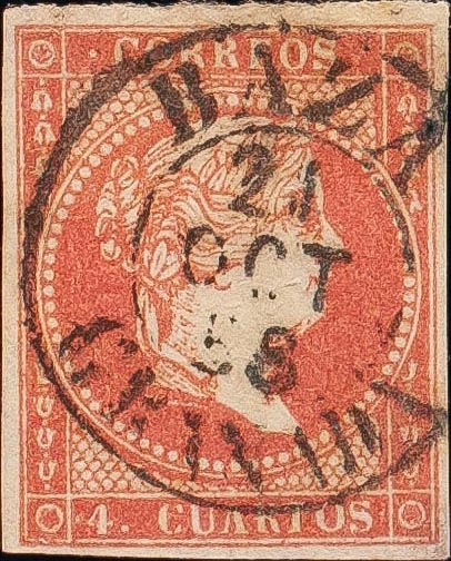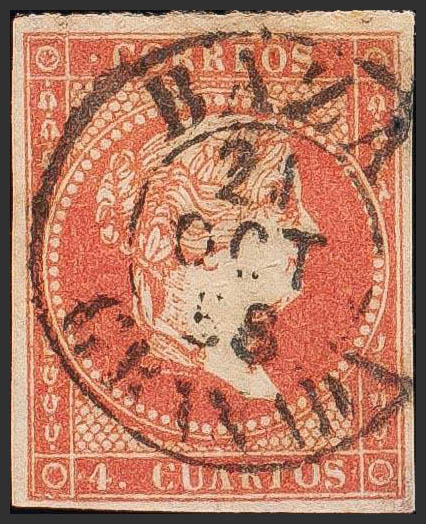 English 48. 1855. 4 cuartos red. BAZA / GRANADA postmark (Type I). MAGNIFICENT AND VERY RARE.