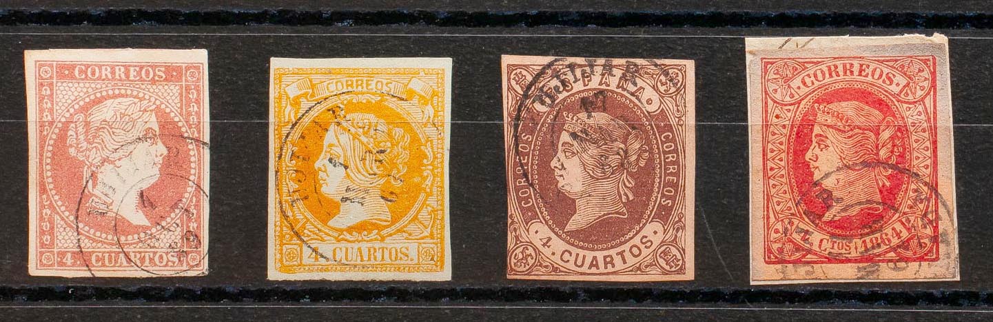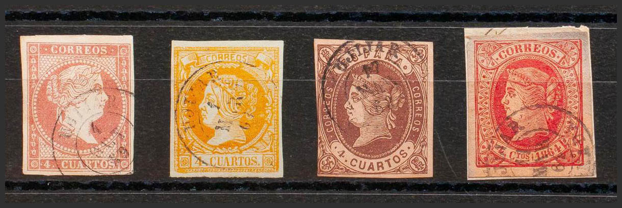 48, 52, 58, 64. (1855ca). Set of four 4- cuartos stamps red, yellow, brown and pink, unused with UJIJAR / GRANADA postmark. MAGNIFICENT.