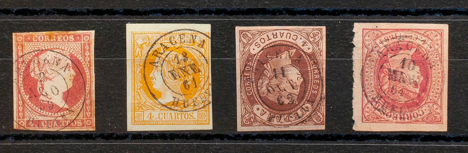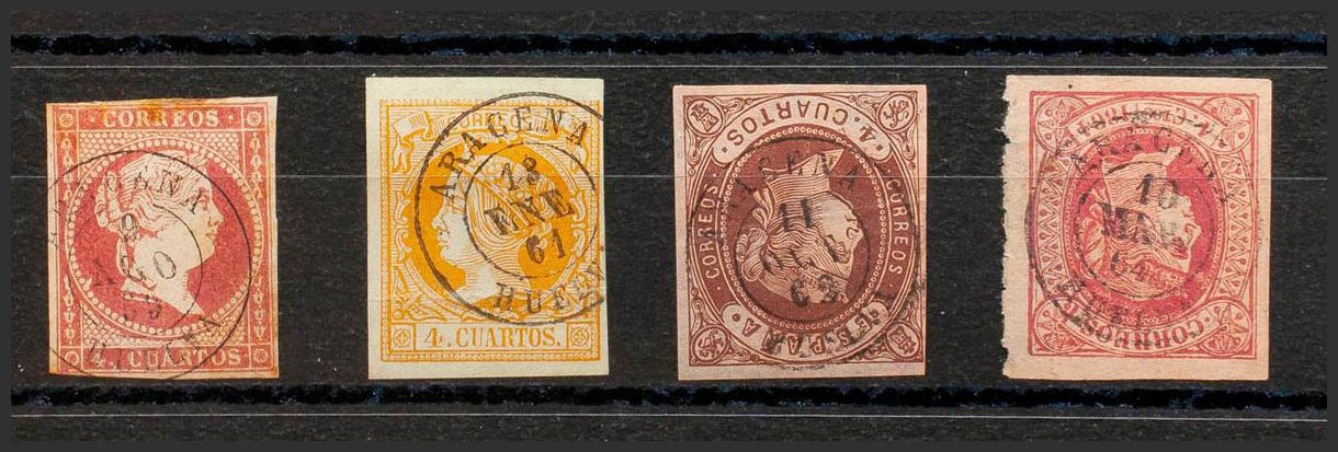 48, 52, 58, 64. (1855ca). Set of four 4- cuartos stamps red, yellow, brown and pink, unused with ARACENA / HUELVA postmark. MAGNIFICENT.