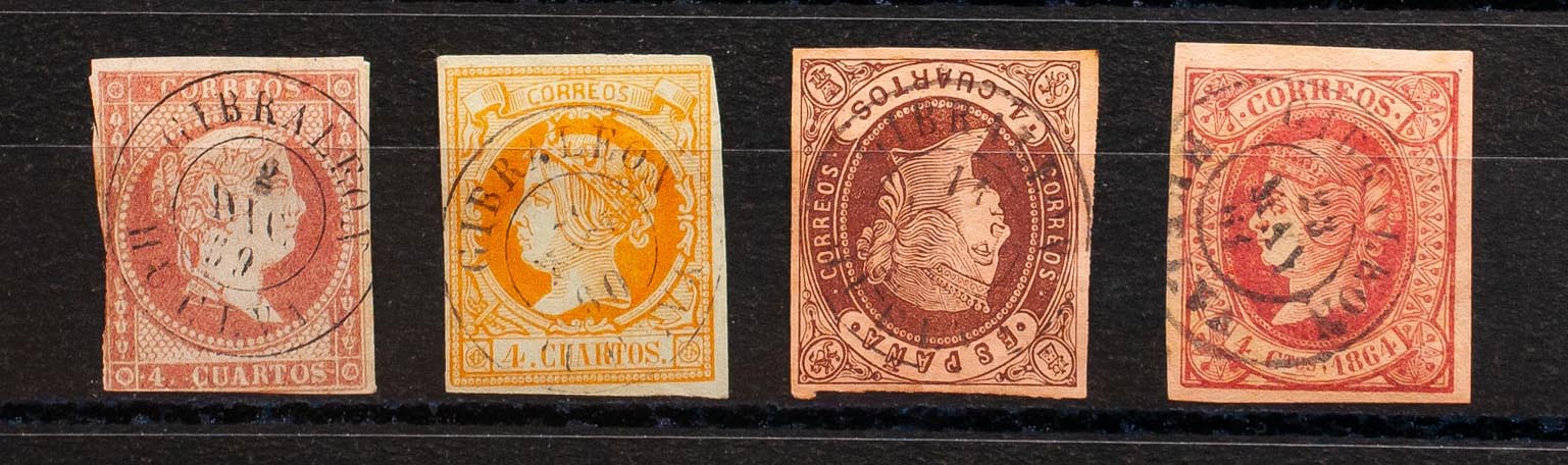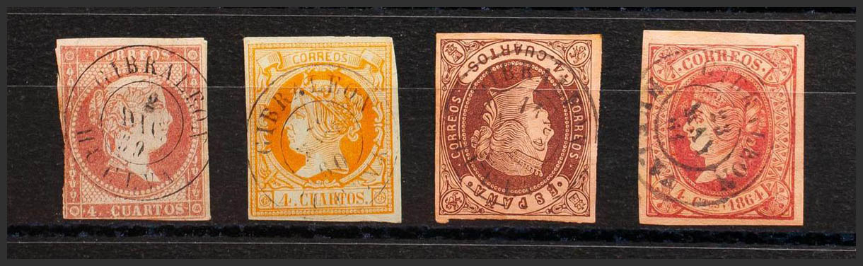 48, 52, 58, 64. (1855ca). Set of four 4- cuartos stamps red, yellow, brown and pink, unused with GIBRALEON / HUELVA postmark. MAGNIFICENT.