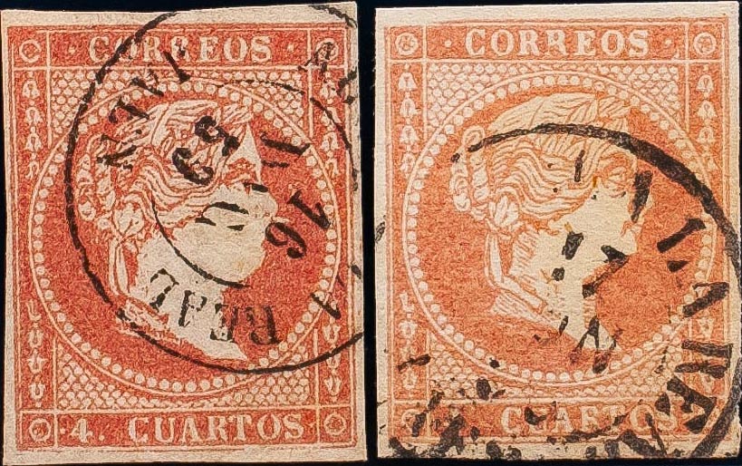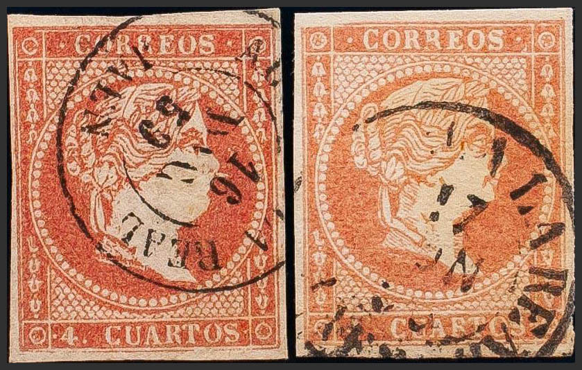 English 48(2). (1855ca). 4 red cuartos , two stamps. Postmark ALCALA LA REAL / JAEN (Types I and II). MAGNIFICENT.