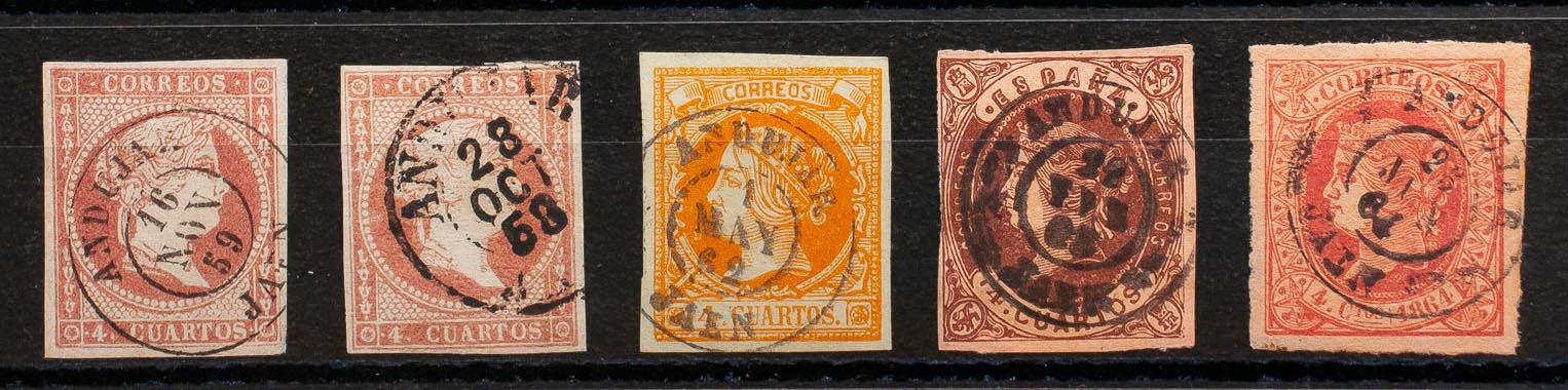 48(2), 52, 58, 64. (1855ca). Set of five 4- cuartos red, yellow, brown and pink stamps, unused with the ANDUJAR / JAEN postmark (including Type I on the 4- cuartos red). MAGNIFICENT.