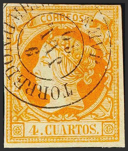 52. 1860. 4 cuartos yellow. Postmark TORREDONJIMENO / JAEN. MAGNIFICENT.