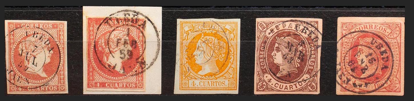 48(2), 52, 58, 64. (1855ca). Set of five 4- cuartos red, yellow, brown and pink stamps, unused with the UBEDA / JAEN postmark (including Type I on the 4- cuartos red). MAGNIFICENT.