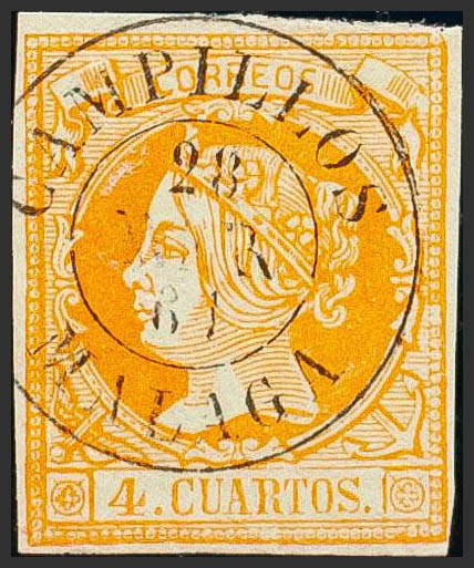 52. 1860. 4 cuartos yellow. Postmark CAMPILLOS / MALAGA. MAGNIFICENT.