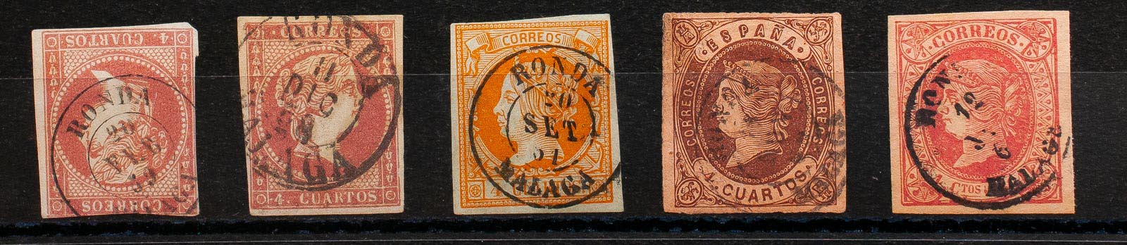 48(2), 52, 58, 64. (1855ca). Set of five 4- cuartos red, yellow, brown and pink stamps, unused with RONDA / MALAGA postmark (including Type I on the 4- cuartos red). PRETTY.