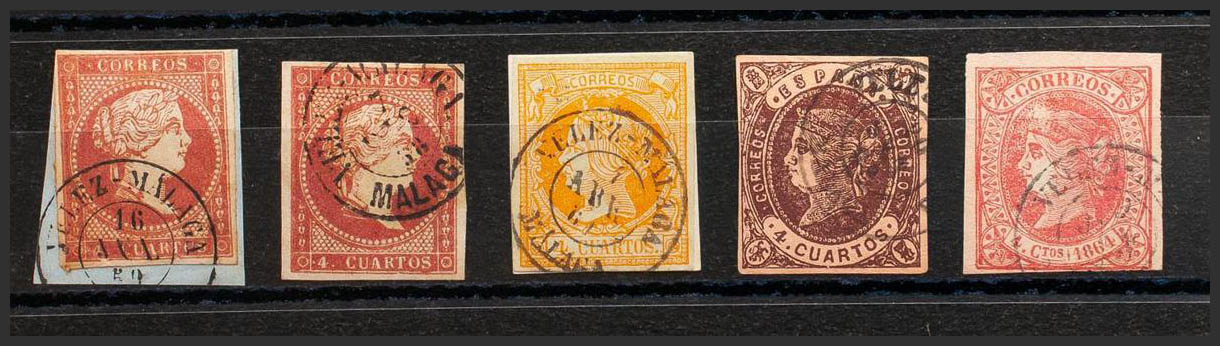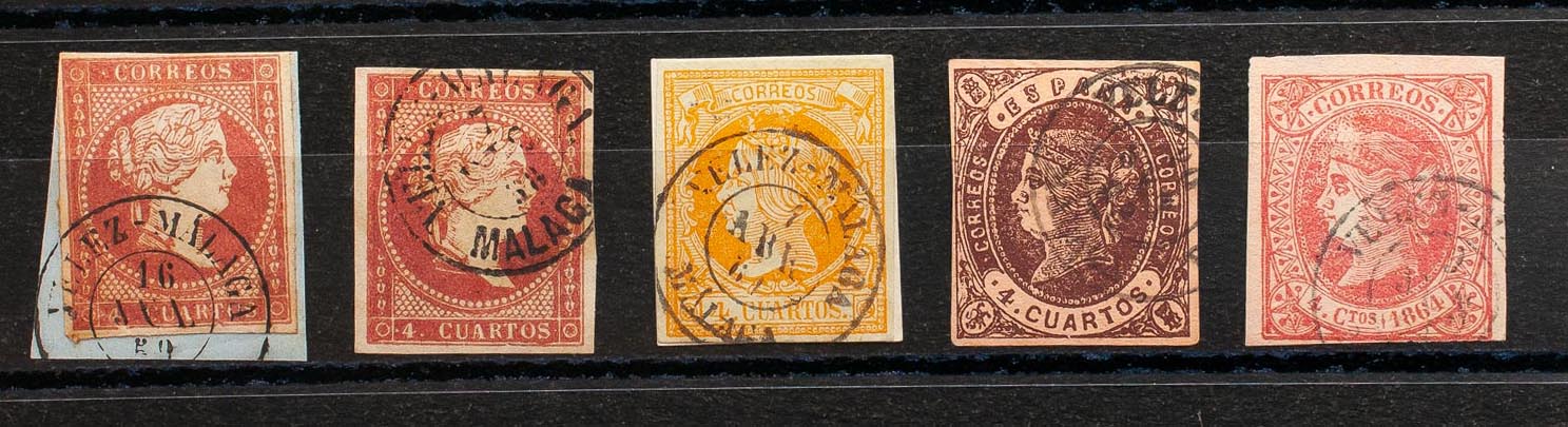 48(2), 52, 58, 64. (1855ca). Set of five 4- cuartos red, yellow, brown and pink stamps, unused with the VELEZ-MALAGA / MALAGA postmark (including Type I on the 4- cuartos red). MAGNIFICENT.