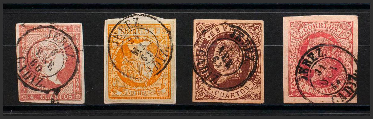 48, 52, 58, 64. (1855ca). Set of four 4- cuartos red, yellow, brown and pink stamps, unused with JEREZ / CADIZ postmark. MAGNIFICENT.