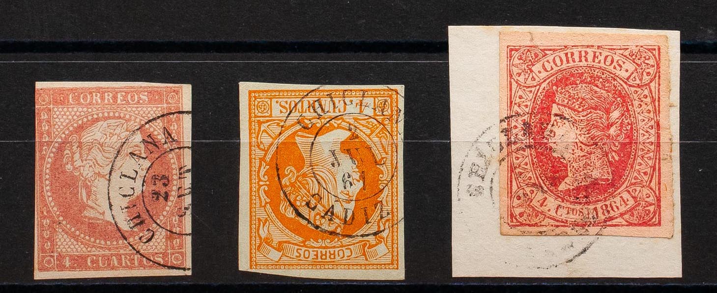 48, 52, 64. (1855ca). Set of three 4- cuartos red, yellow and pink stamps, unused with CHICLANA / CADIZ postmark. MAGNIFICENT.