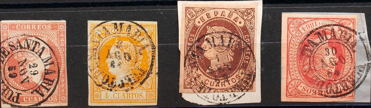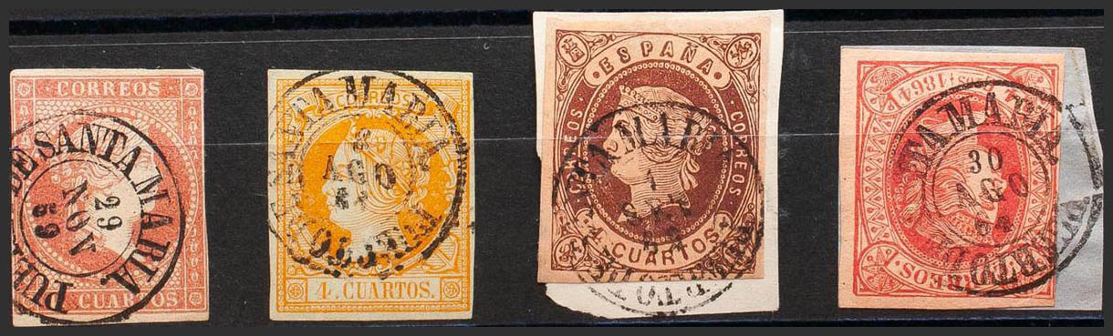 48, 52, 58, 64. (1855ca). Set of four 4- cuartos stamps red, yellow, brown and pink, unused with PUERTO DE SANTA MARIA postmark. MAGNIFICENT.